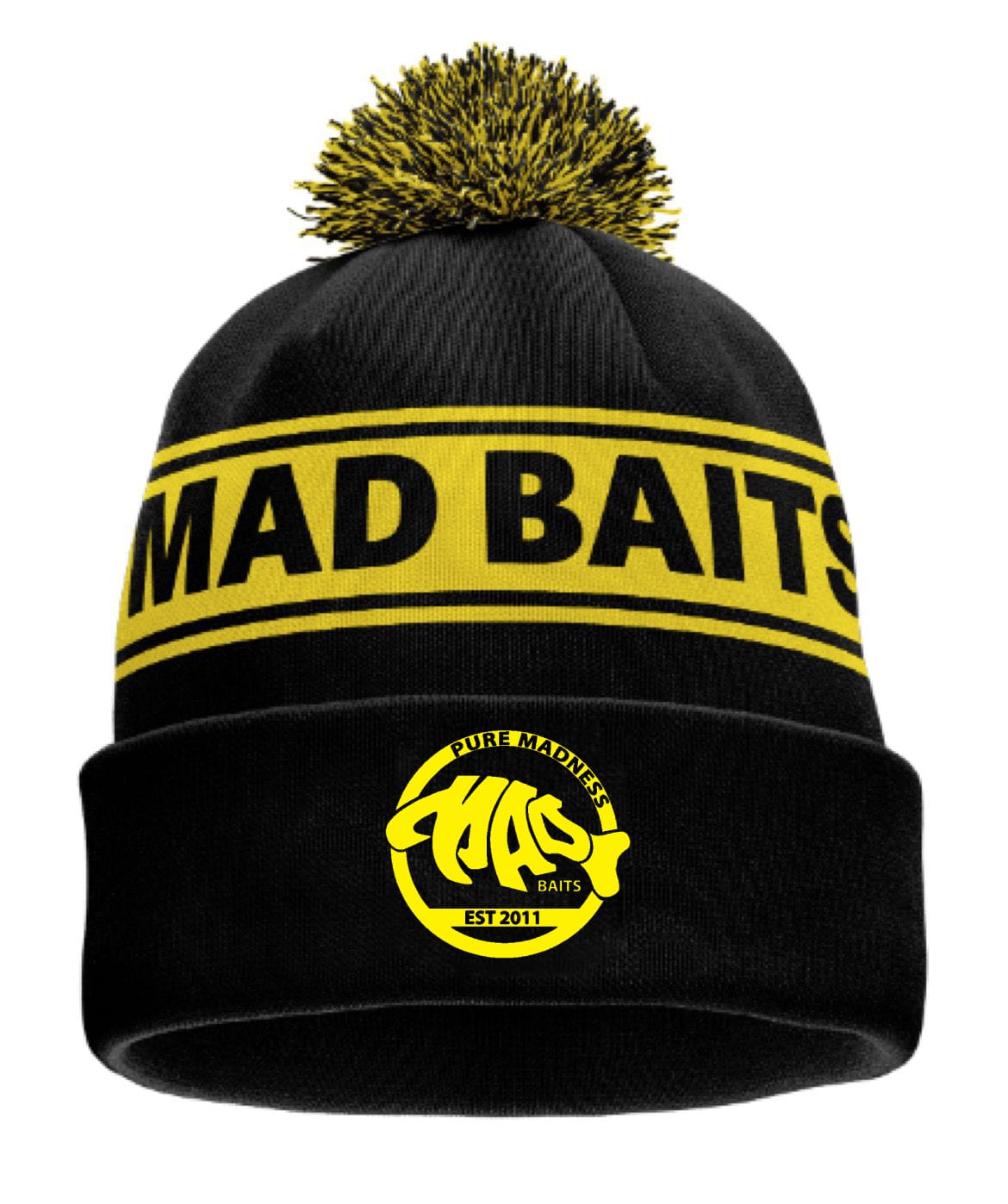 A knitted yellow bobble hat featuring the iconic MAD Baits branding. Warm, comfy, and easy to spot on the bank.